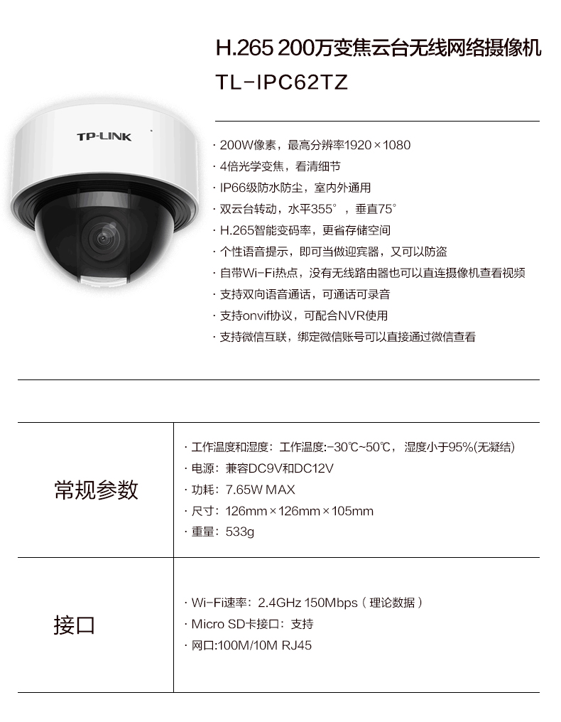 TPLINK無線雲台ハイビジョン監視カメラ4倍ズーム家庭用携帯電話遠隔制御モニタ音声対話家庭室内外防水防犯カメラヘッドTL-PC 62 TZ【1080 p】4倍光学ズーム版64 G